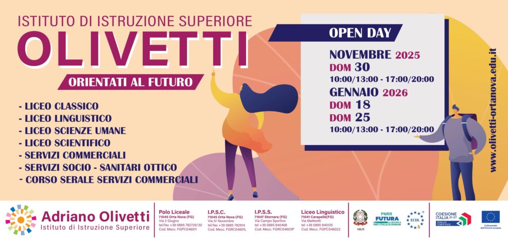 La cittadinanza dei 5 Reali Siti è invitata a partecipare alle giornate di Open Day organizzate dall’Istituto “Adriano Olivetti”. Vi aspettiamo!!!